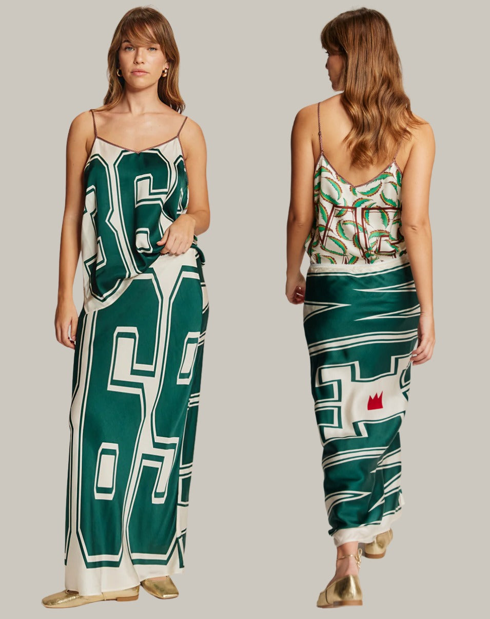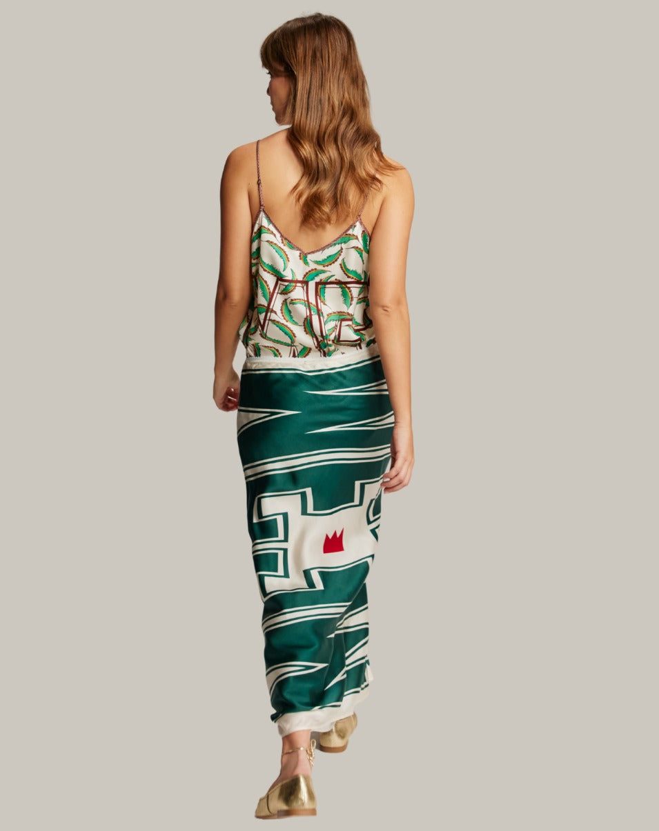 An everyday essential reimagined, the Angelique Camisole is light, versatile, and instantly elevates your look. Perfect worn solo or layered under a jacket, its bold Sporty Jade print makes it anything but basic. Pair with the Blakely Slip Skirt for a cool yet feminine edge.