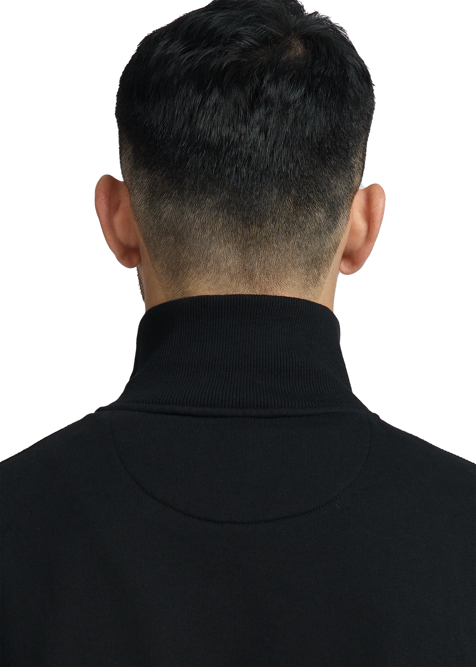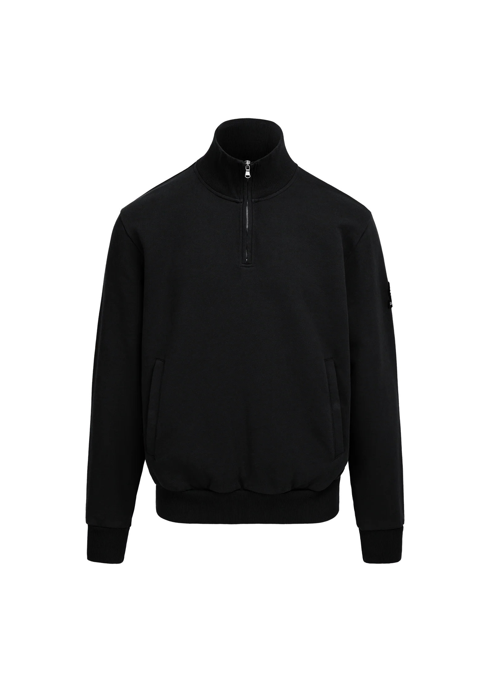 Sandbanks badge logo quarter zip sweatshirt in black, made from a 400gsm diagonal knitted 100% BCI cotton fabric that features a slight brushed back for a superior soft feeling and warmth, whilst remaining breathable. This quarter zip sweatshirt features a Lampo metal zip in silver with a ribbed neck.