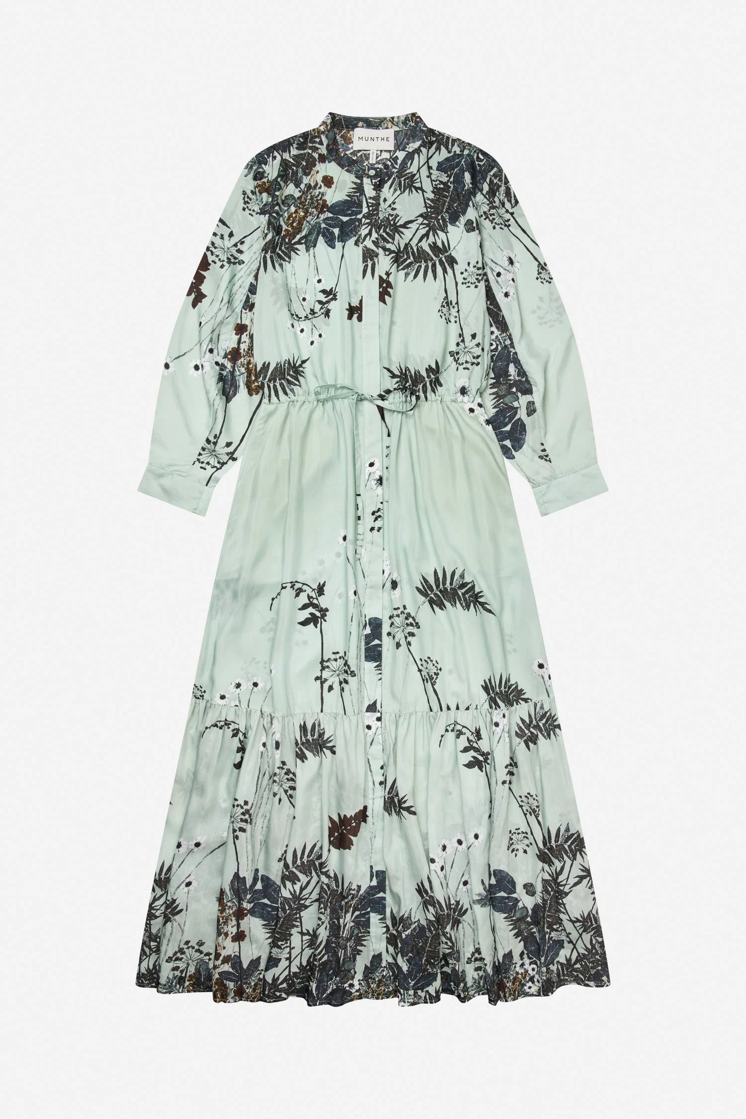 Dress crafted from a lightweight fabric featuring a botanical print. It is designed with a button-through front, long cuffed sleeves, and a drawstring that allows the waist to be adjusted.