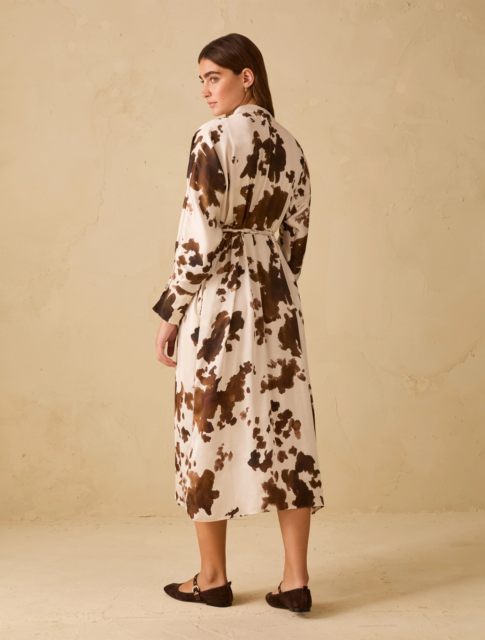 With a flowing silhouette in shiny satin, this cow print dress reinterprets country atmospheres with a chic twist