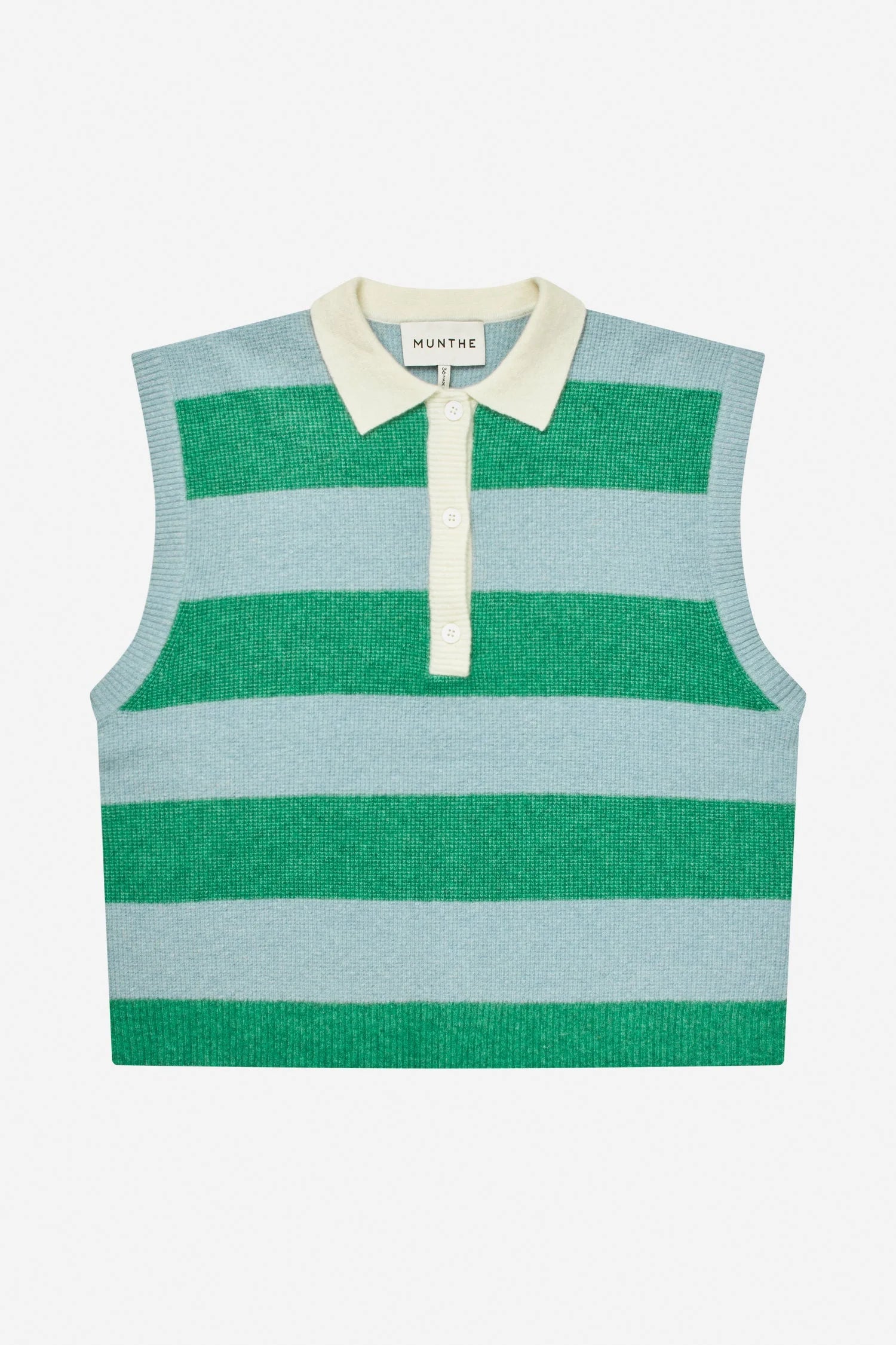 Sleeveless knitted top with wide horizontal stripes. Designed with a contrast collar, and button details. The silhouette makes it suitable both for layering or wearing on its own.