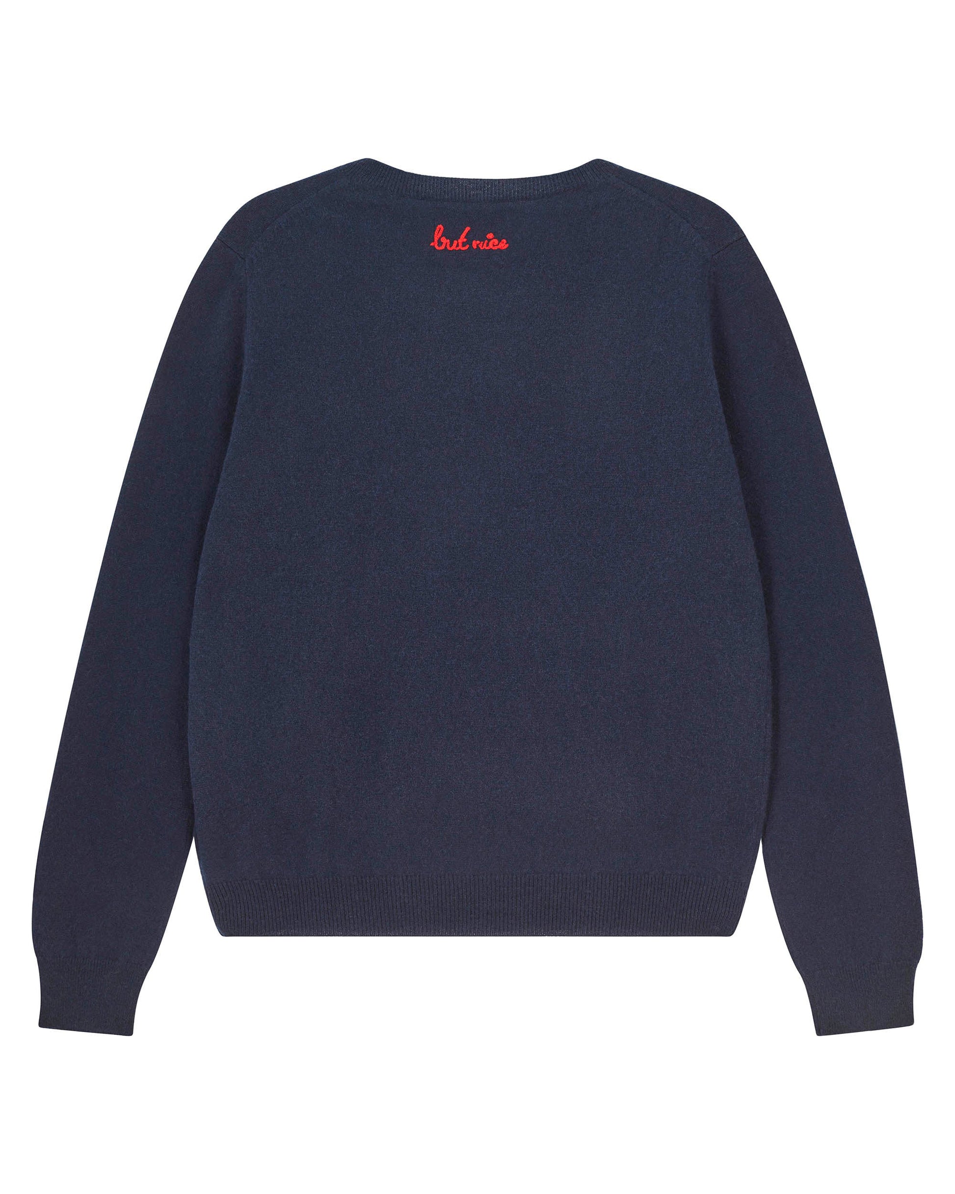 Jumper 1234 cashmere jumper. Navy cashmere crew neck jumper with red 'naughty' chain stitch embroidery on the chest and 'but nice' on the back. We love this jumper so much and just couldn't cut down the colour options, so have offered it in grey and navy. Oh and its also true to size.