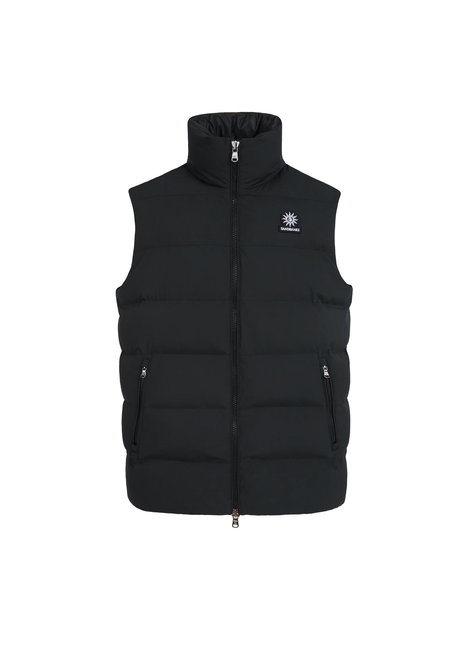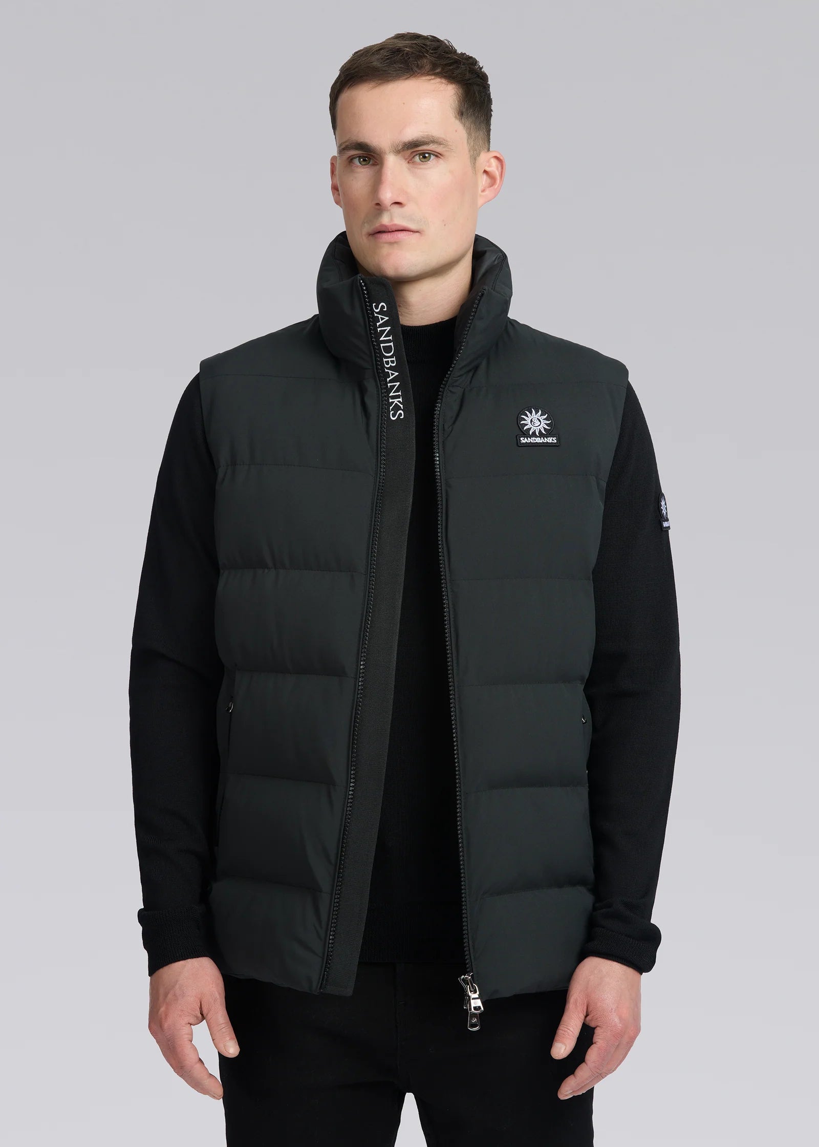 Sandbanks Clifftop zip pocket gilet in black. This lightweight gilet is made almost entirely from recycled plastic bottles and features statement Sandbanks placket embroidery, swirl embroidered chest badge logo, YKK zippers with gunmetal engraved pullers.