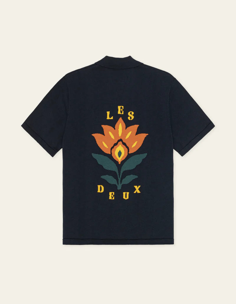 A soft knitted short sleeve shirt with a relaxed camp collar. The back features a seasonal jacquard artwork that adds a bold graphic expression to the clean front.