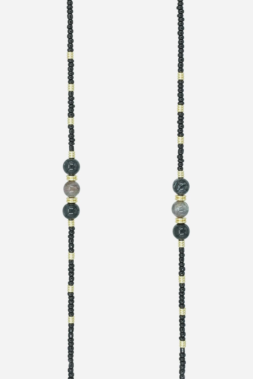 The black Iris phone chain, made of black beads and gold-plated tassels, is 120 cm long and clips onto our ring cases or adapters with its gold-plated carabiners. It was designed in Marseille and handmade.