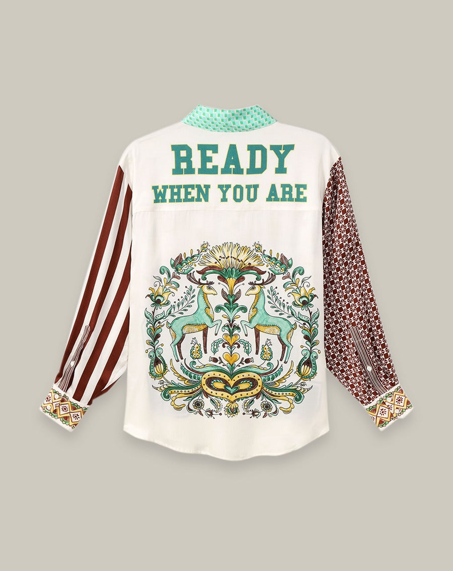 Playful yet polished, the Isabel Sporty Jade Shirt is a true statement piece. With its bold “36” graphic across the front, contrasting sleeves, and intricate detailing, it’s designed to stand out from every angle. The back reveals a “Ready When You Are” slogan with a vibrant wreath motif, making it as expressive as it is versatile. Pair with the matching Bailey pants for a full look.