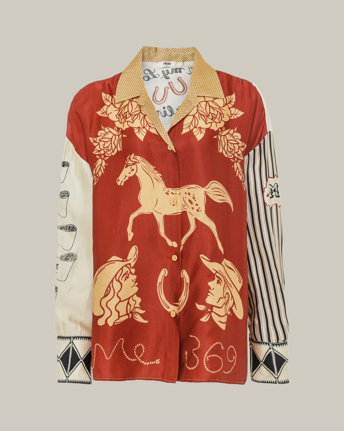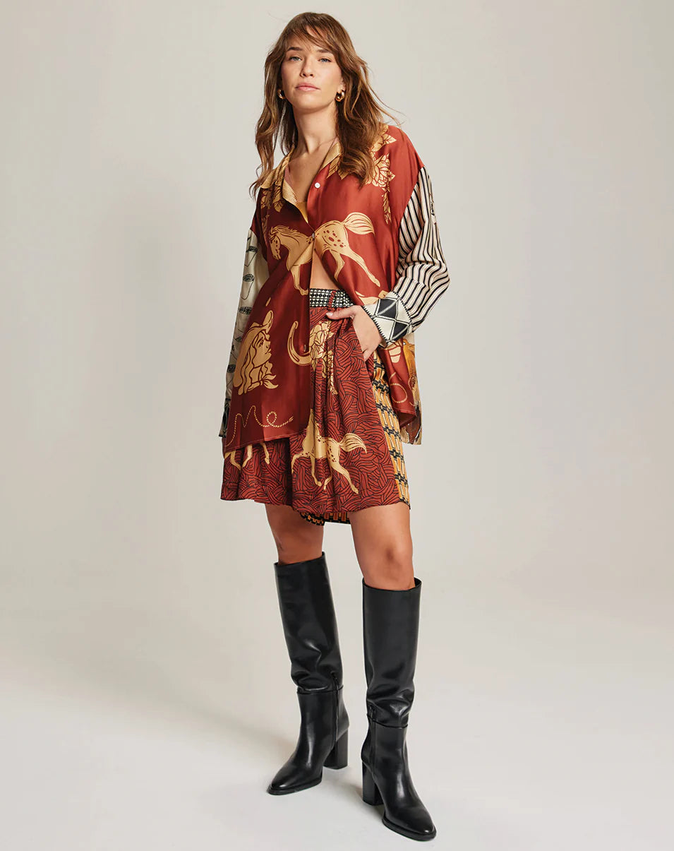 The Parker shirt brings the drama with its bold Rodeo pattern and contrasting cuffs. Designed with a button-down front and structured collar, it strikes the balance between playful and polished. Wear with the Juliette shorts or denim for standout styling.