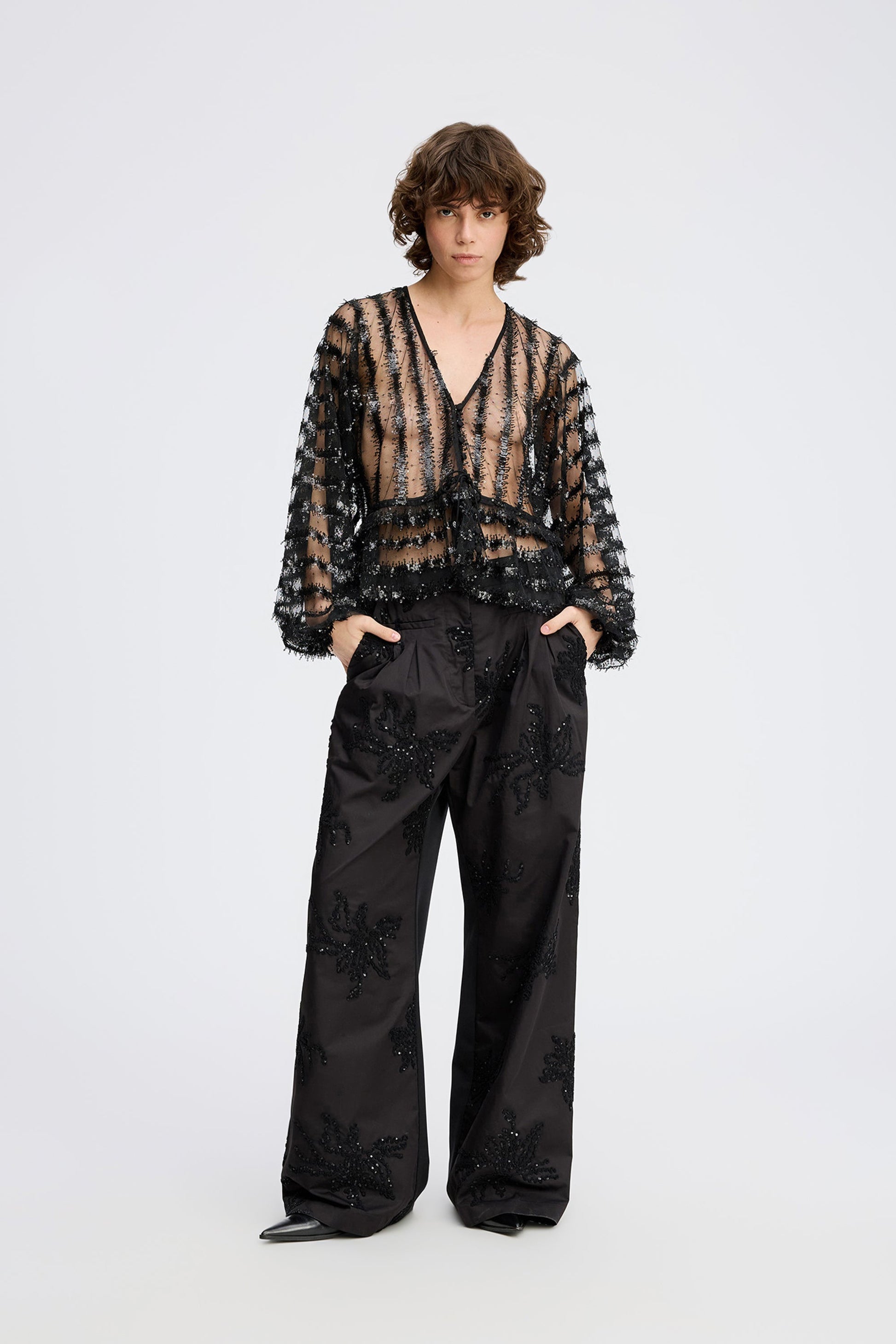 Beautiful, sheer sequin blouse with long, slightly puffed sleeves and a feminine V-neckline. At the waist, there is a tie belt that can be fastened with a delicate bow.