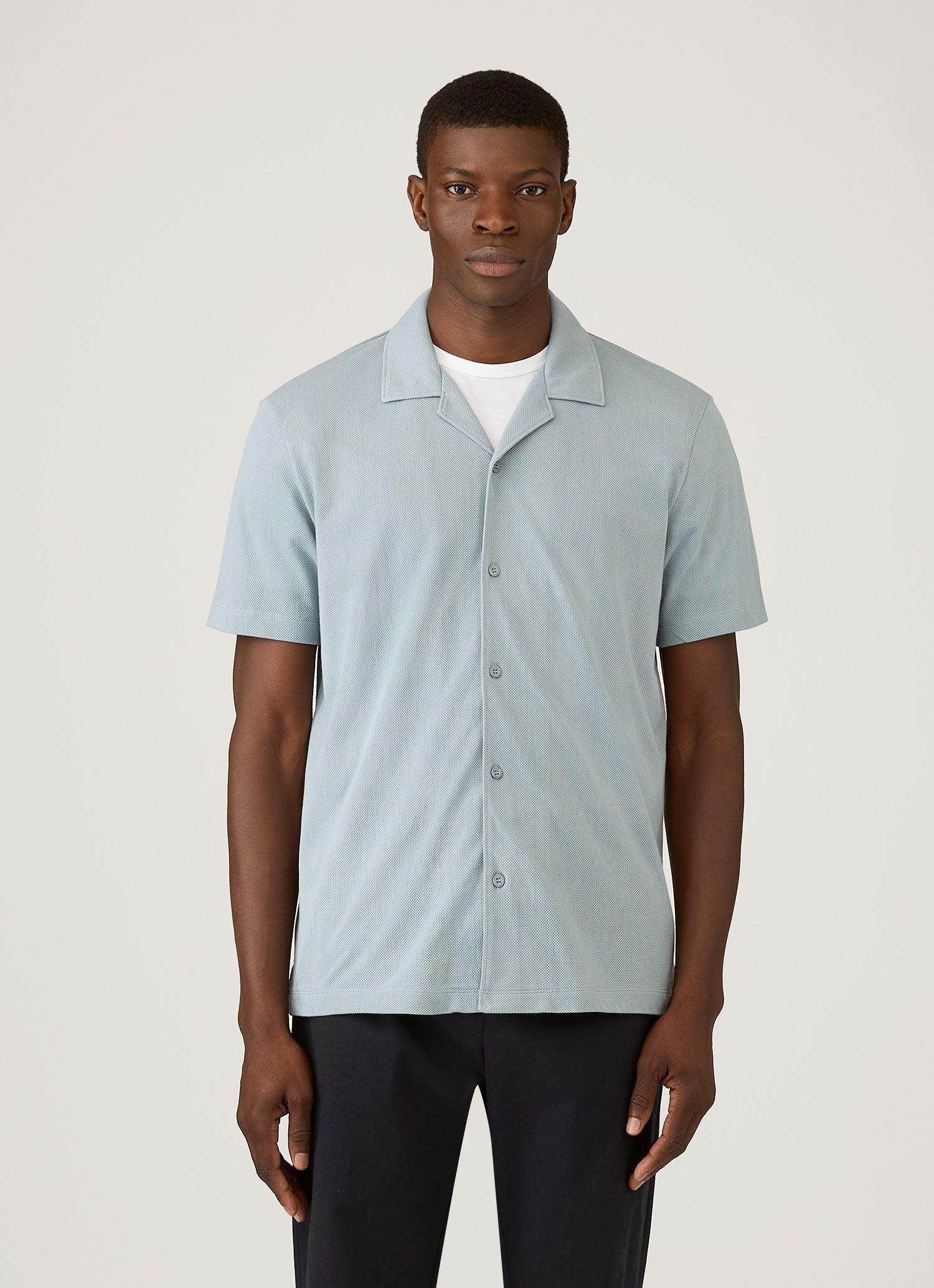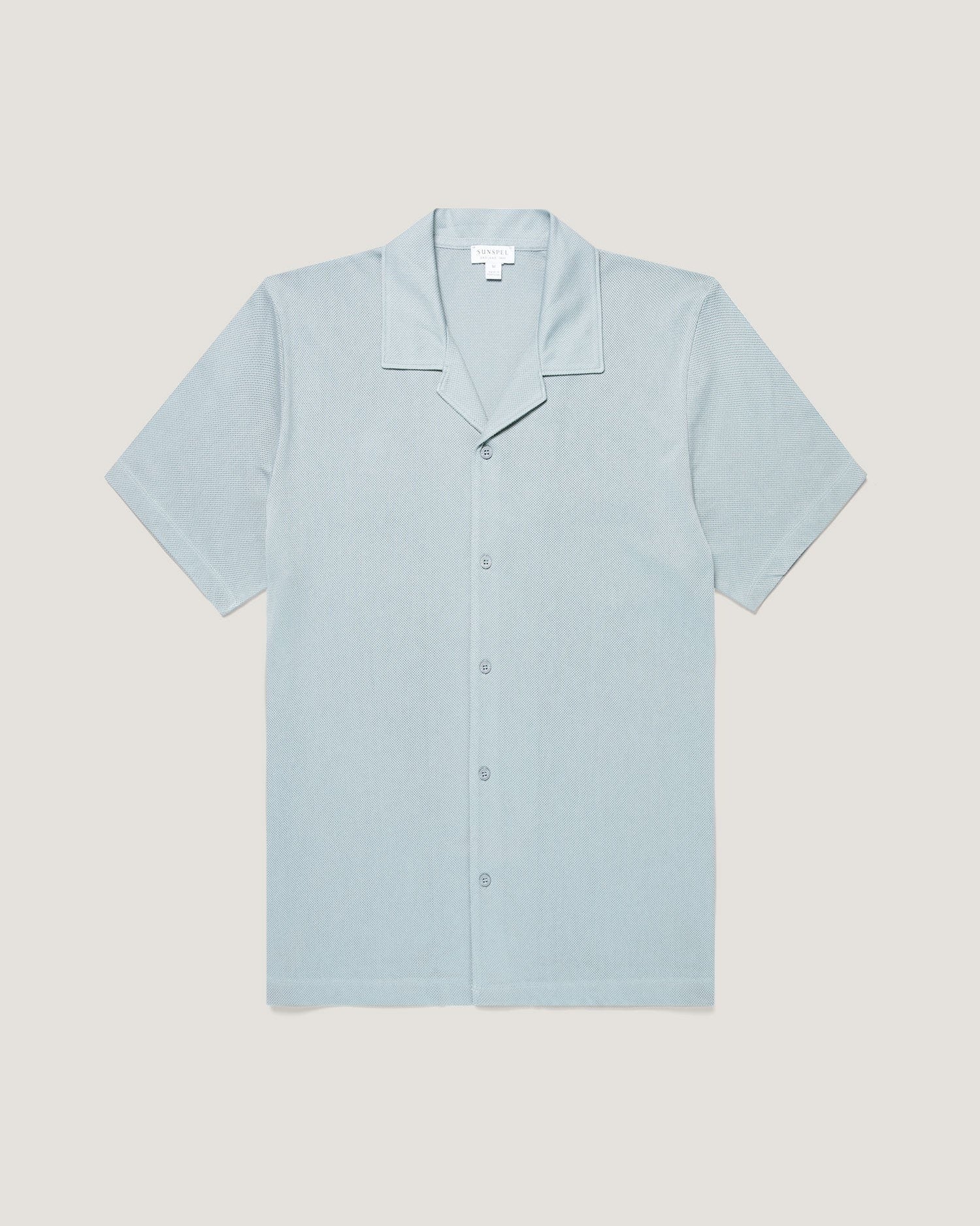 A camp collar version of the Riviera Polo Shirt which was made iconic by Daniel Craig in Casino Royale. The cool cotton mesh was designed for the heat of the French Riviera and is lightweight, breathable and very soft. Regular fit with matching buttons and a refined collar. The ultimate short-sleeve summer shirt.