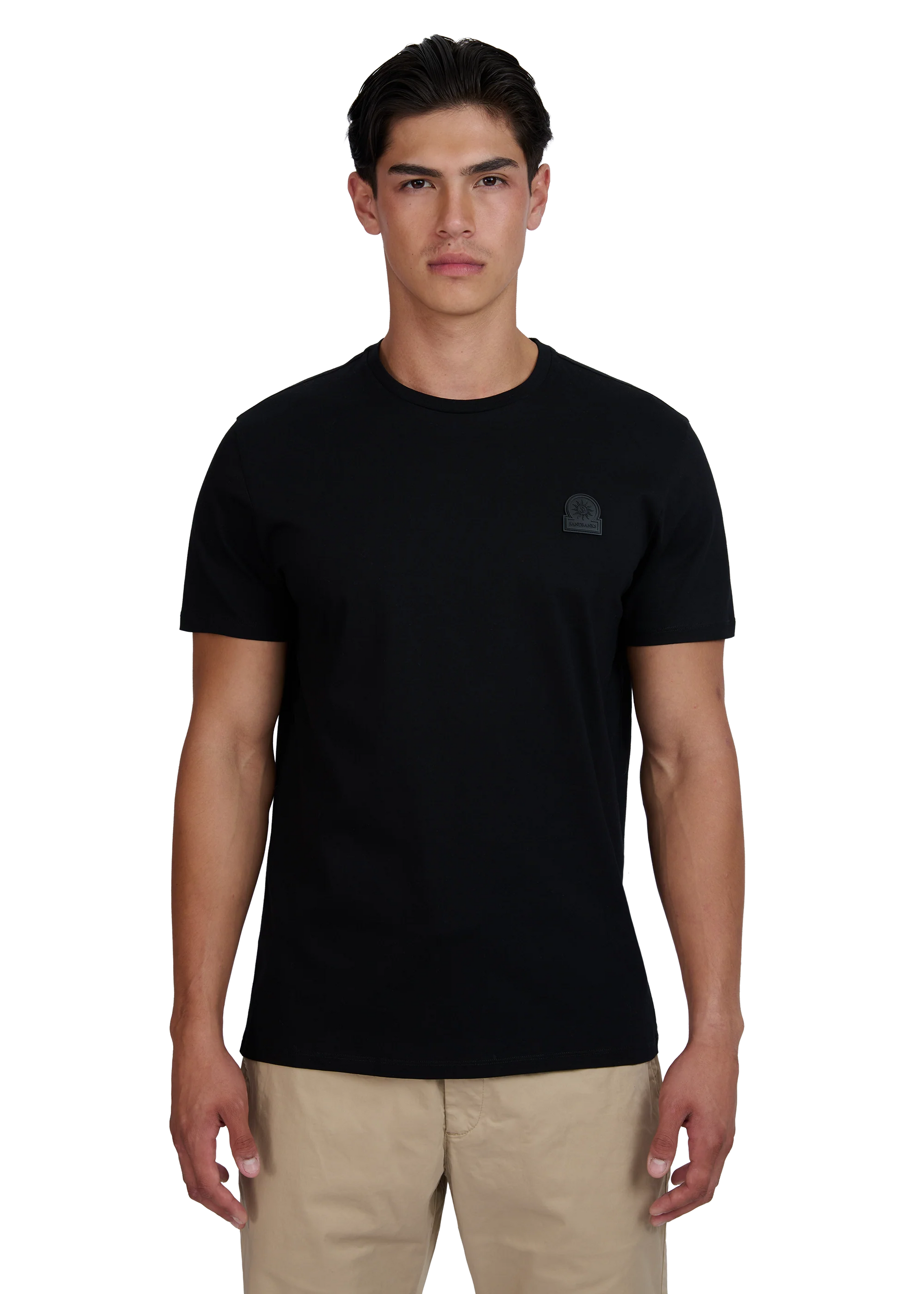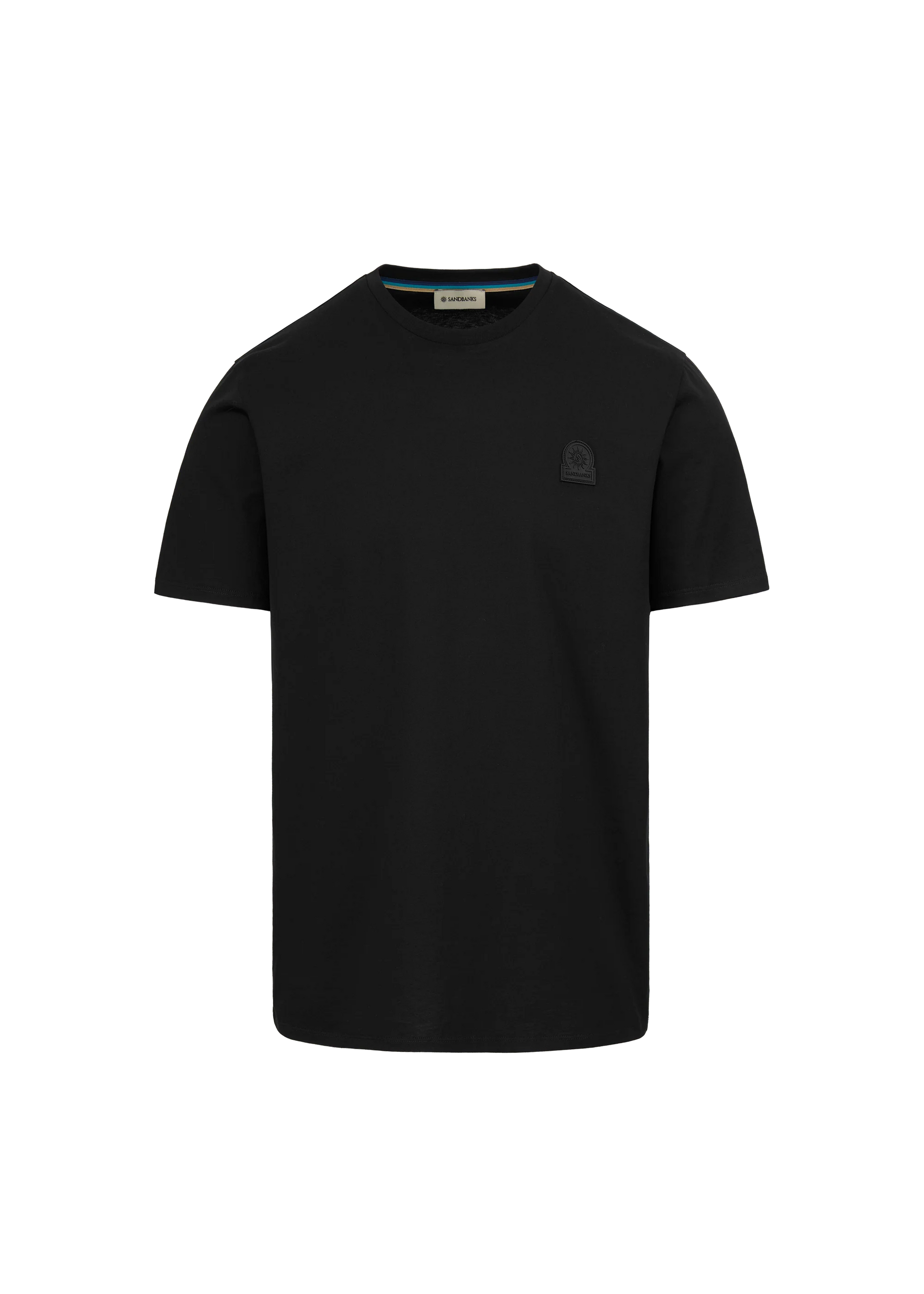 Sandbanks men's rubberised badge logo t-shirt in black, made from mercerised cotton for a silky and luxurious feel. This classic fitting crew neck t-shirt features a rubberised logo badge on the chest and tri-colour back neck binding.