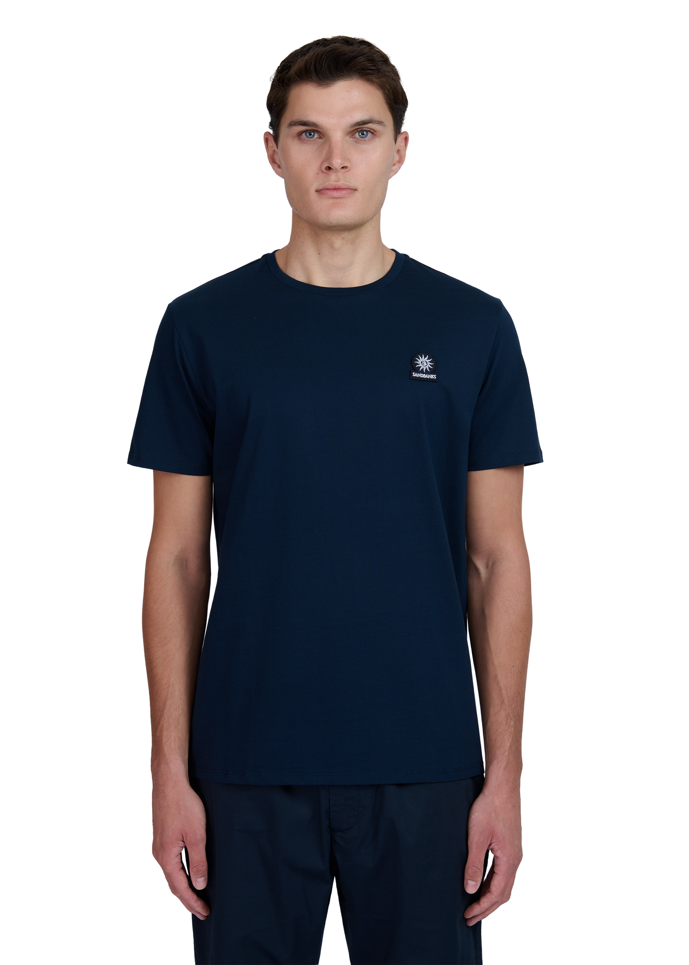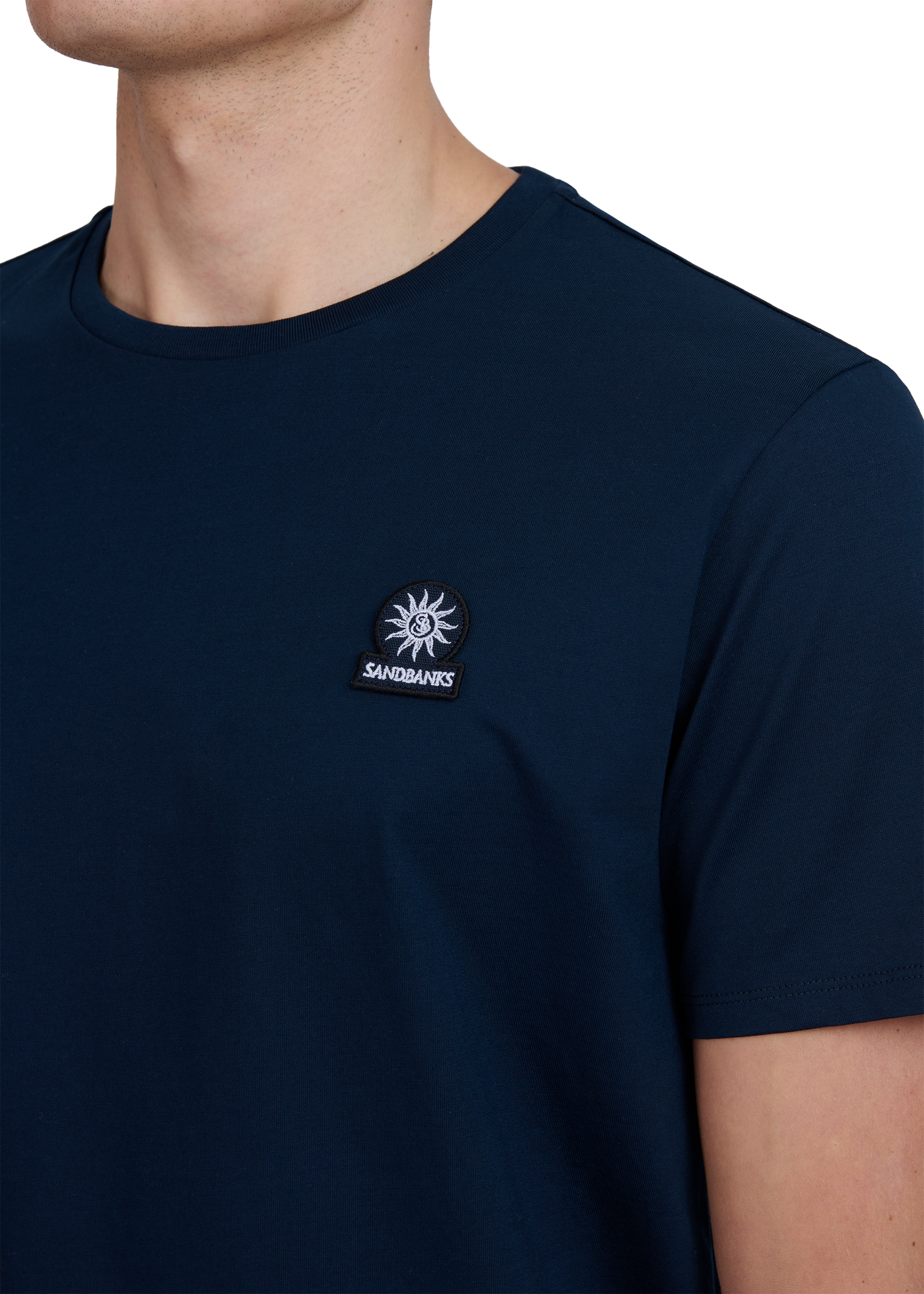 Sandbanks men's badge logo t-shirt in navy, made from mercerised cotton for a silky and luxurious feel. This classic fitting crew neck t-shirt features an embroidered badge logo on the chest and tri-colour back neck binding.