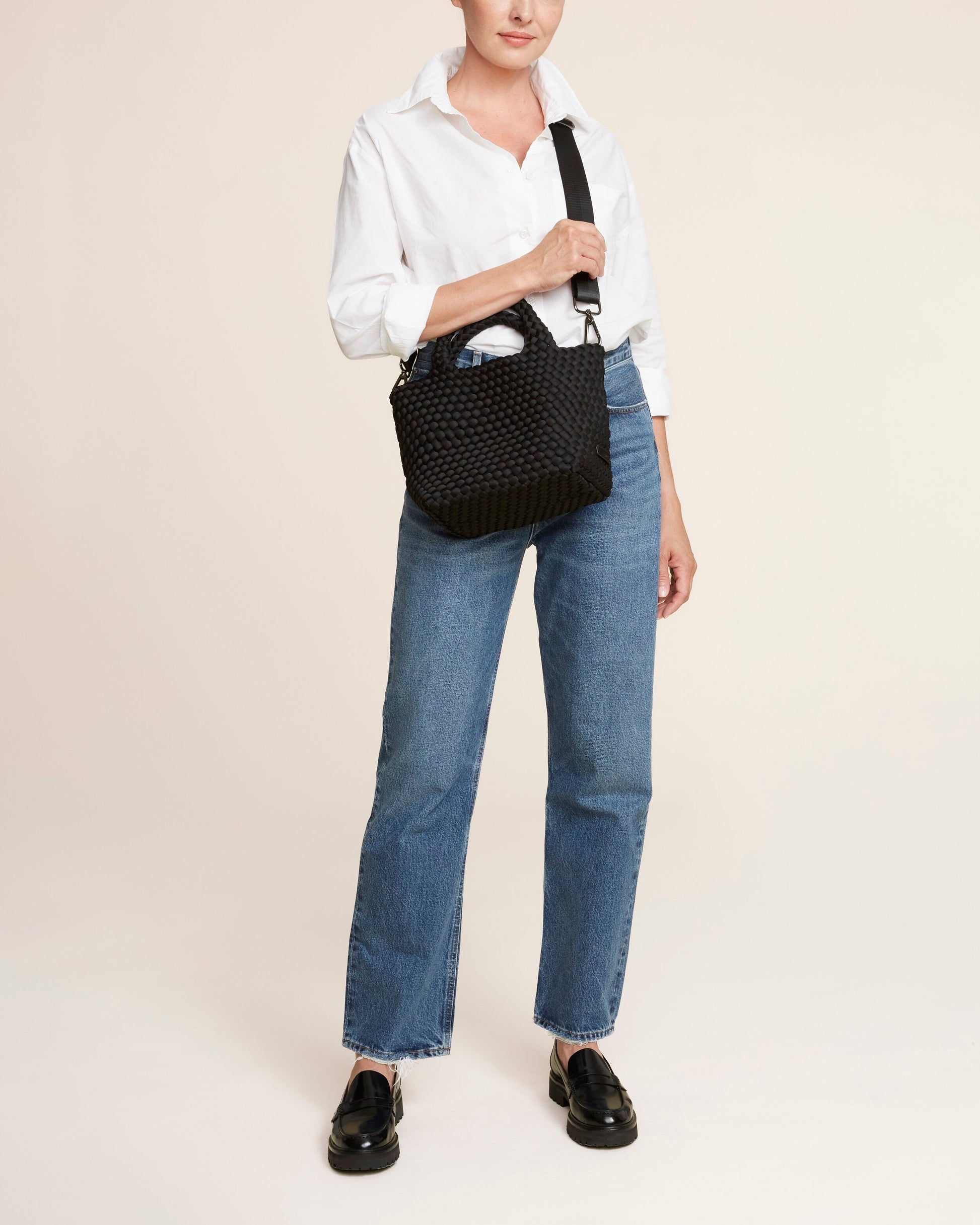 The St. Barths Small Tote in Onyx redefines everyday ease. Sleek, minimal, and woven by hand in jet-black neoprene, it’s a lightweight staple that carries beautifully from day to night. The detachable strap lets you wear it crossbody or by hand, while the included pouch keeps smaller items neatly tucked away. Effortless, durable, and quietly luxurious.