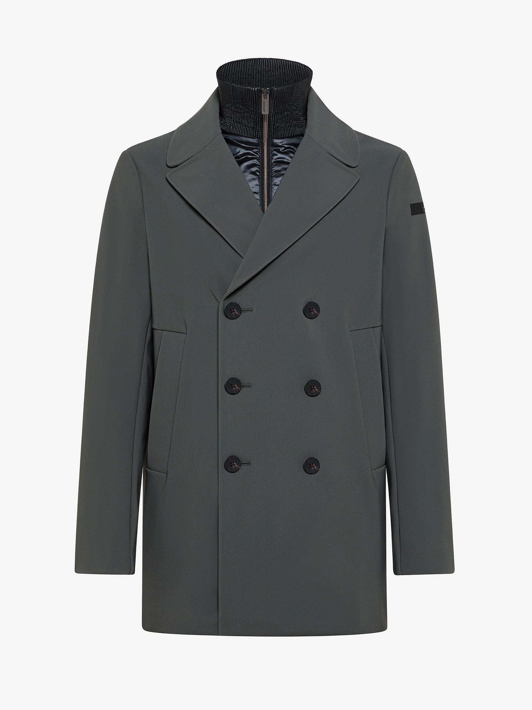The mid-length peacoat, an evolution of mid season's favorite men's wardrobe must-have, is presented in waterproof and breathable membrane Stratofabric #3. The shell's super-matte look in exclusive SURFLEX®, sleek and smooth to the touch, and selective internal thermo-taping construction add durability and a contemporary touch to a garment of understated, timeless elegance inspired by the mariner's tradition. For cooler, windier fall days, the outerwear offers the protection of a removable, zippered, padded nylon front with a smock-stitched ribbed turtleneck. A fine horn placket closes the double-breasted jacket with wide lapels and signature side track pockets. The back slit allows for maximum movement in the regular fit. Inside, the warm, fine black velvet lining is enlivened by the zippered pocket with fluo orange welts and the "Made with love, designed in Tuscany" heart tag. The black micro-injected logo on the left sleeve completes this highly successful continuation of the Collection